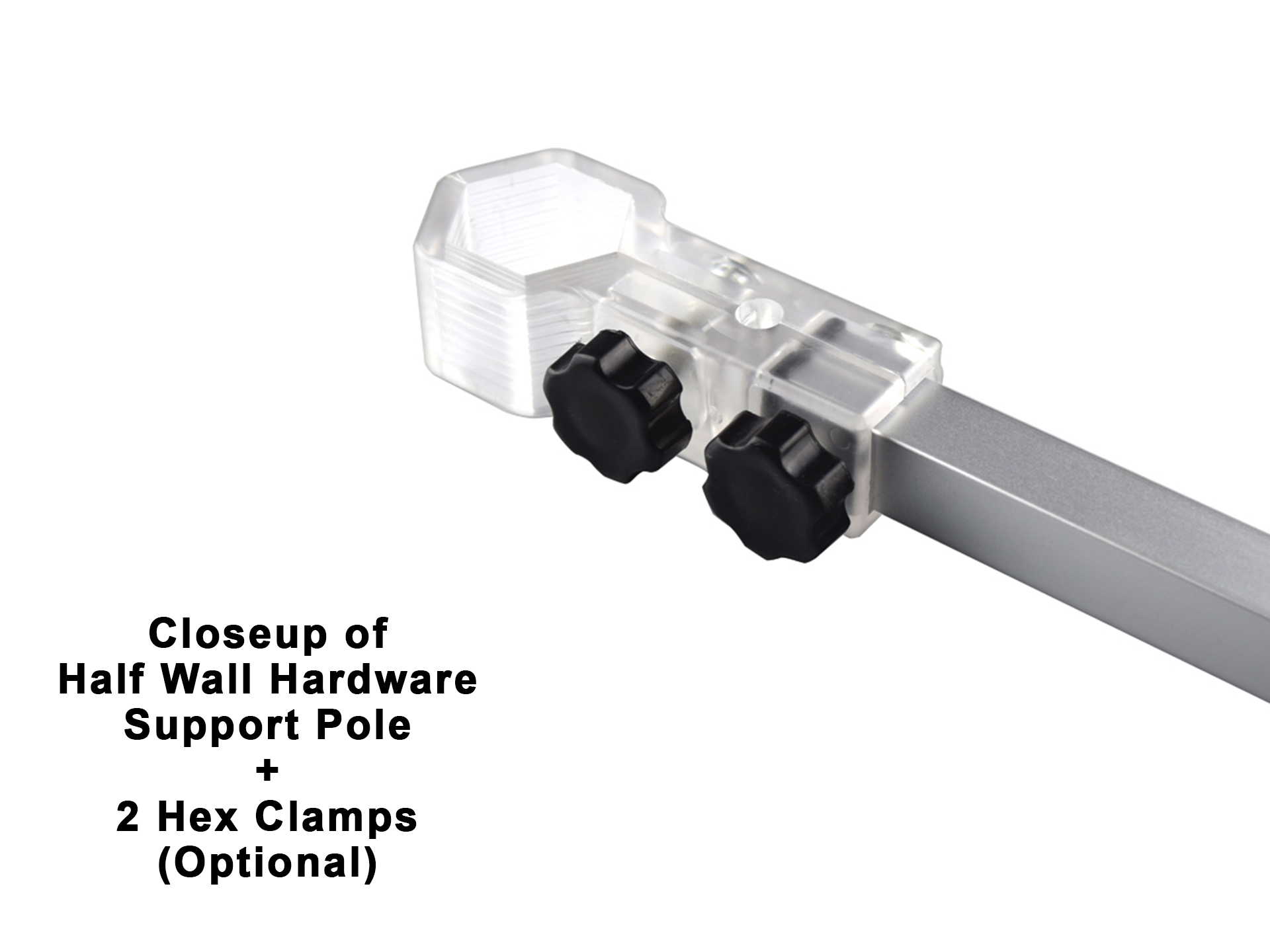 Half Walls are supported with Half Wall hardware. Hardware comes with one telescopic pole and 2 Hex Clamps made specifically to attach to our Premium Aluminum Tent Hardware.